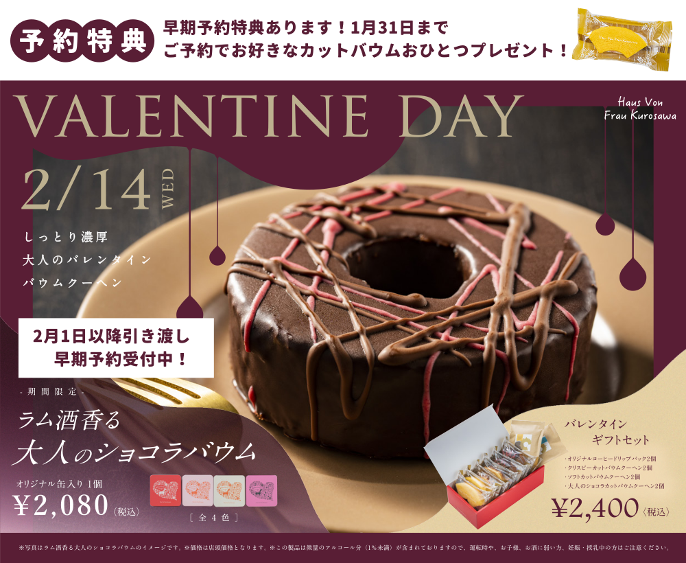 贅沢にチョコレートを使った、ラムの甘美な余韻を楽しむバレンタイン限定バウムクーヘンです。